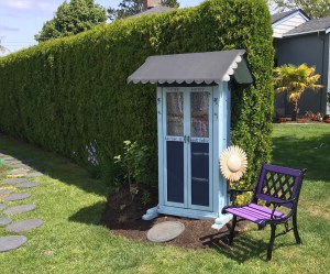 A newly refurbished bench has been added next to my little library for your browsing pleasure. And, you will notice that it has been painted my favorite color!