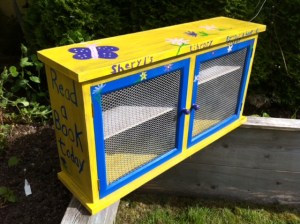 I was going to put it on legs but apparently the wind in this town might be enough to blow it over. Instead, once it dries, I’ll bolt it to my fence and fill it with books. More pictures and a full report about summer library users to come later.