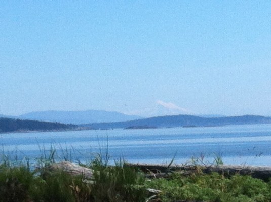 A gorgeous hot day yesterday so went on a lovely bike ride from Mattick’s Farm to Island View Beach in Saanichton with my friend Janet Daines. It’s only about a 7 kilometer ride, but it requires quite a climb along Island View Road which is followed by a long curvy downhill section. Janet had no trouble with the hill, but I had to get off my bike about half way up the hill because I don’t have great hill climbing gears. The ride is pretty much through farm country so it was gorgeous. And, arriving at Island View Beach, the views were even prettier. It was clear enough to see Mount Baker today too, a bonus.