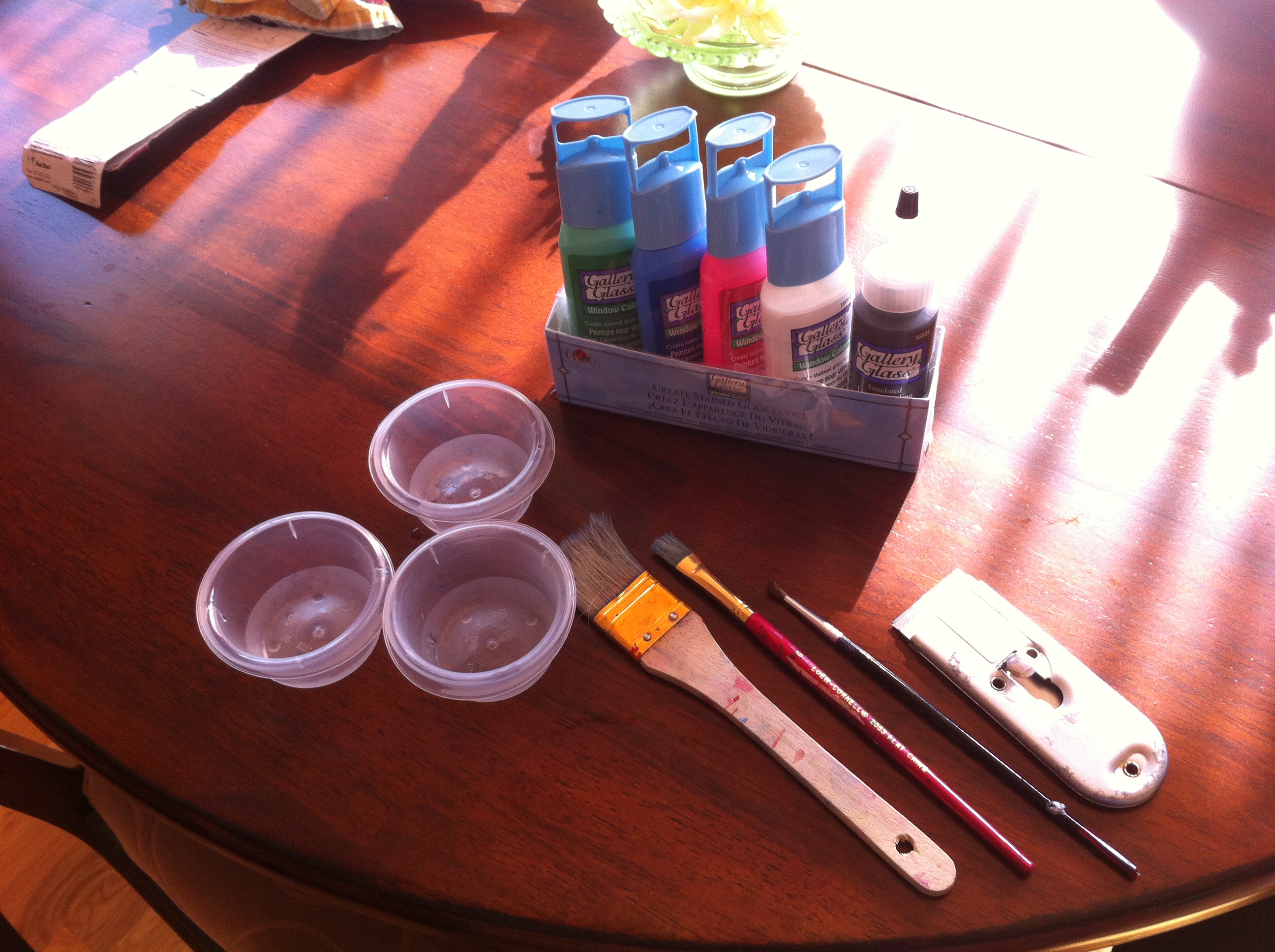 an old window, simulated liquid leading, glass paint in several colors (available at craft stores…), paint brushes, a glass scraper or one-sided razor blade with a handle, and plastic containers for the paint.