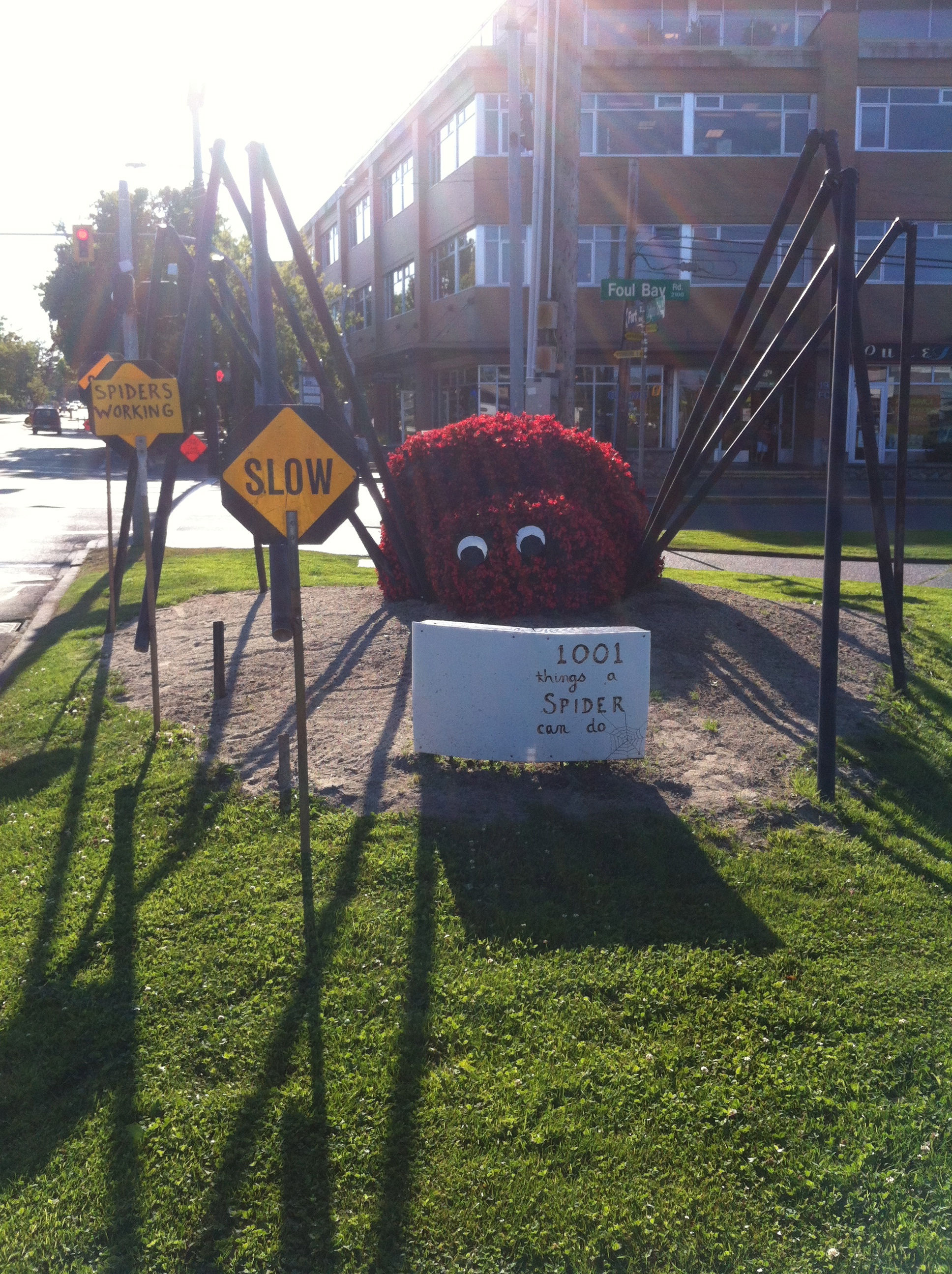 The Oak Bay Horticulturist is at it again. I’ve seen this flower spider reading, playing tennis, and now working on a construction site. I wonder what he’ll be doing next. Too cute!